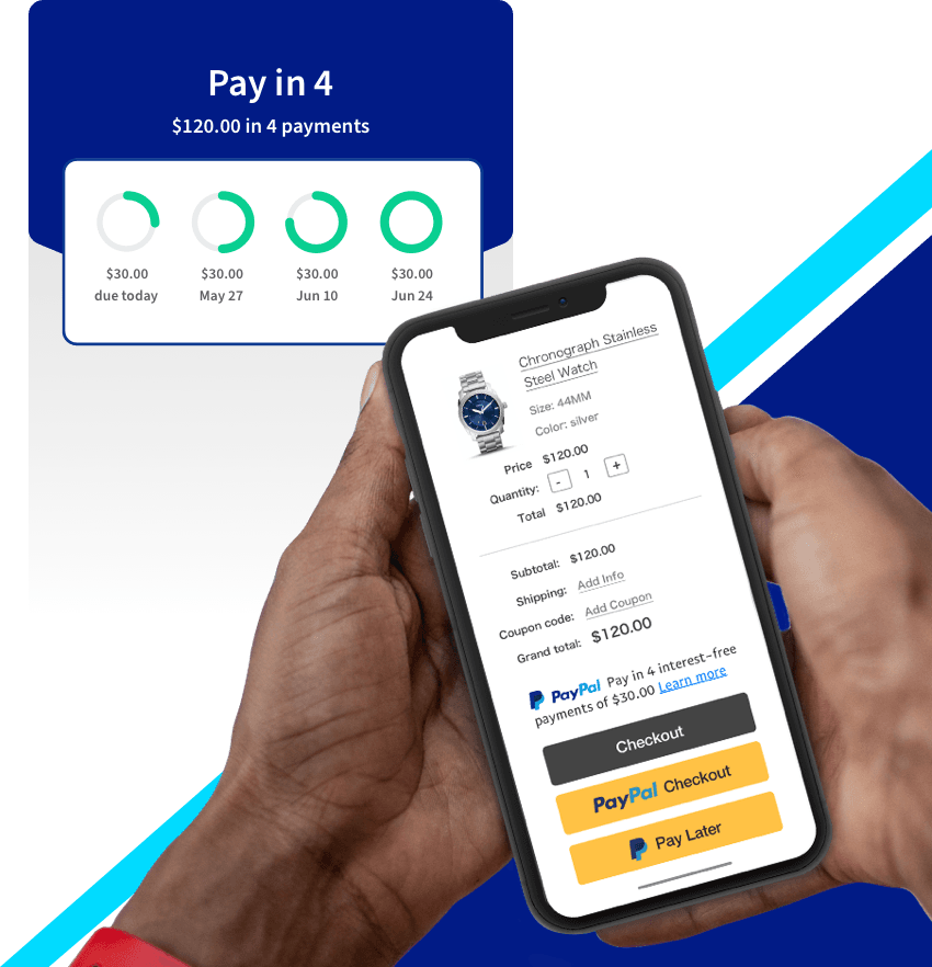 Offering PayPal Credit at checkout can increase order sizes as much as 68%2. Customers can easily apply at checkout, get a decision in seconds1, and 40% of shoppers end up spending more3 as a result.
